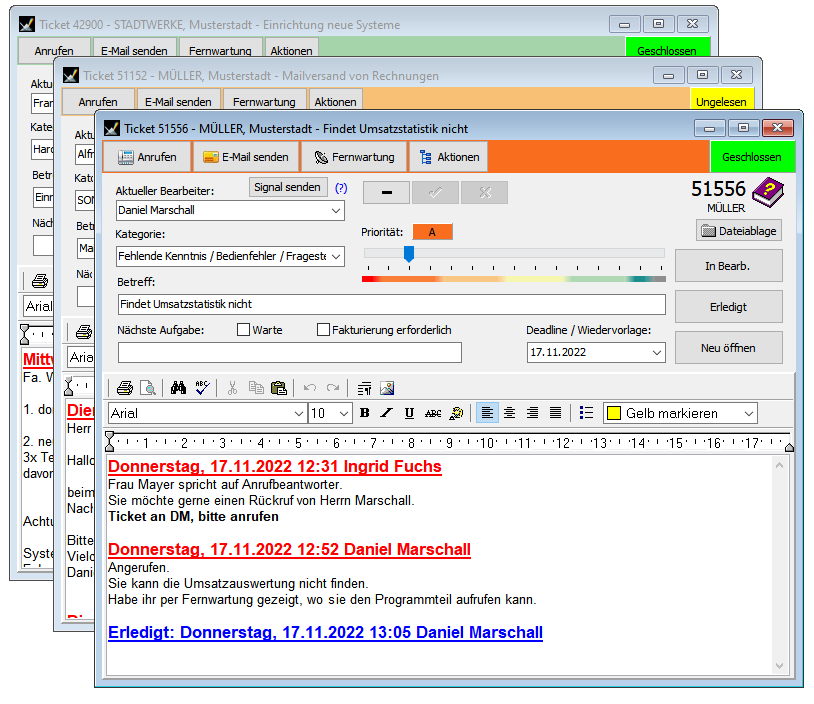 - Tickets können in mehreren Fenstern gleichzeitig offen sein und bearbeitet werden
